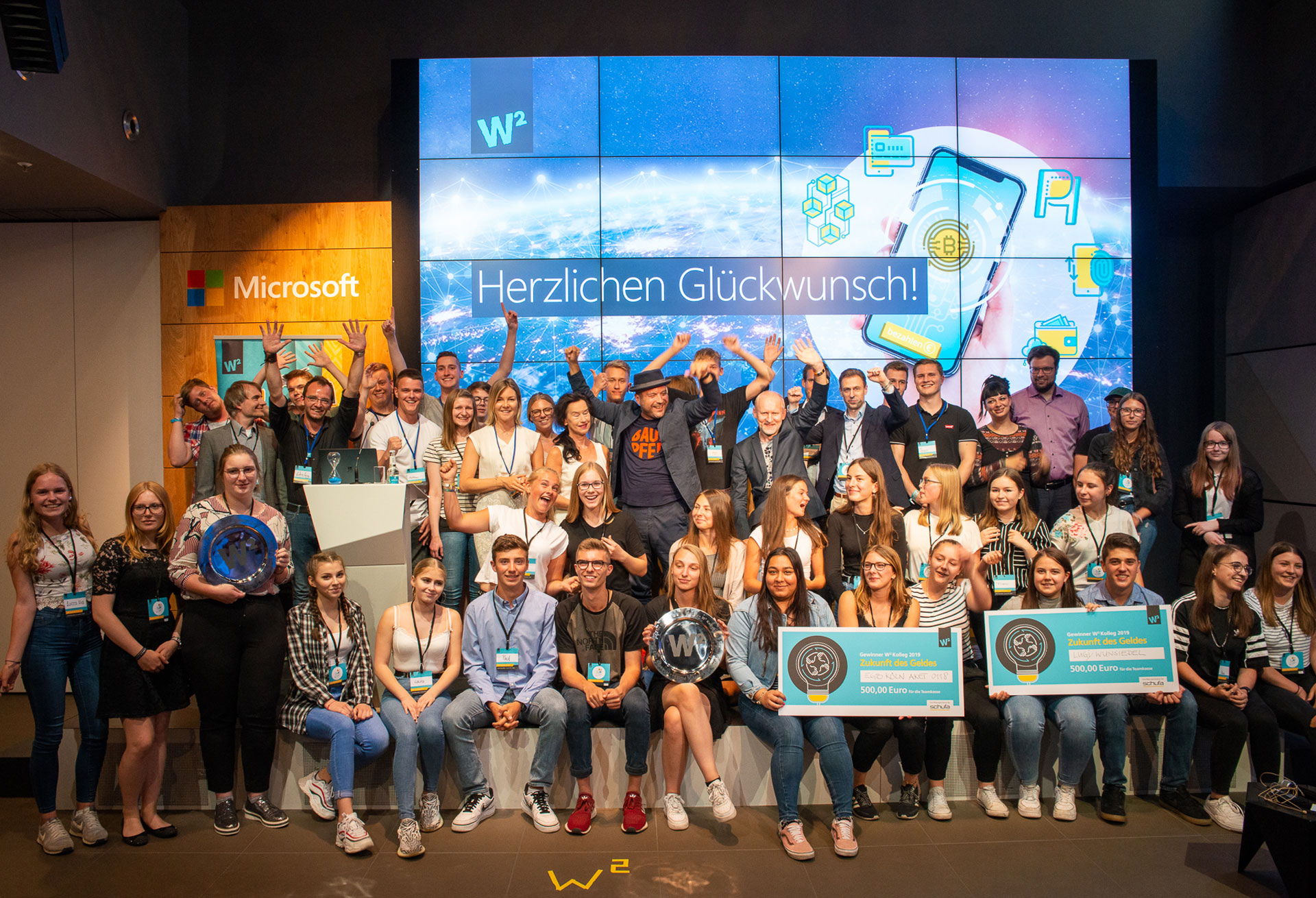 Große Gruppe auf einer Bühne bei einer Preisverleihung