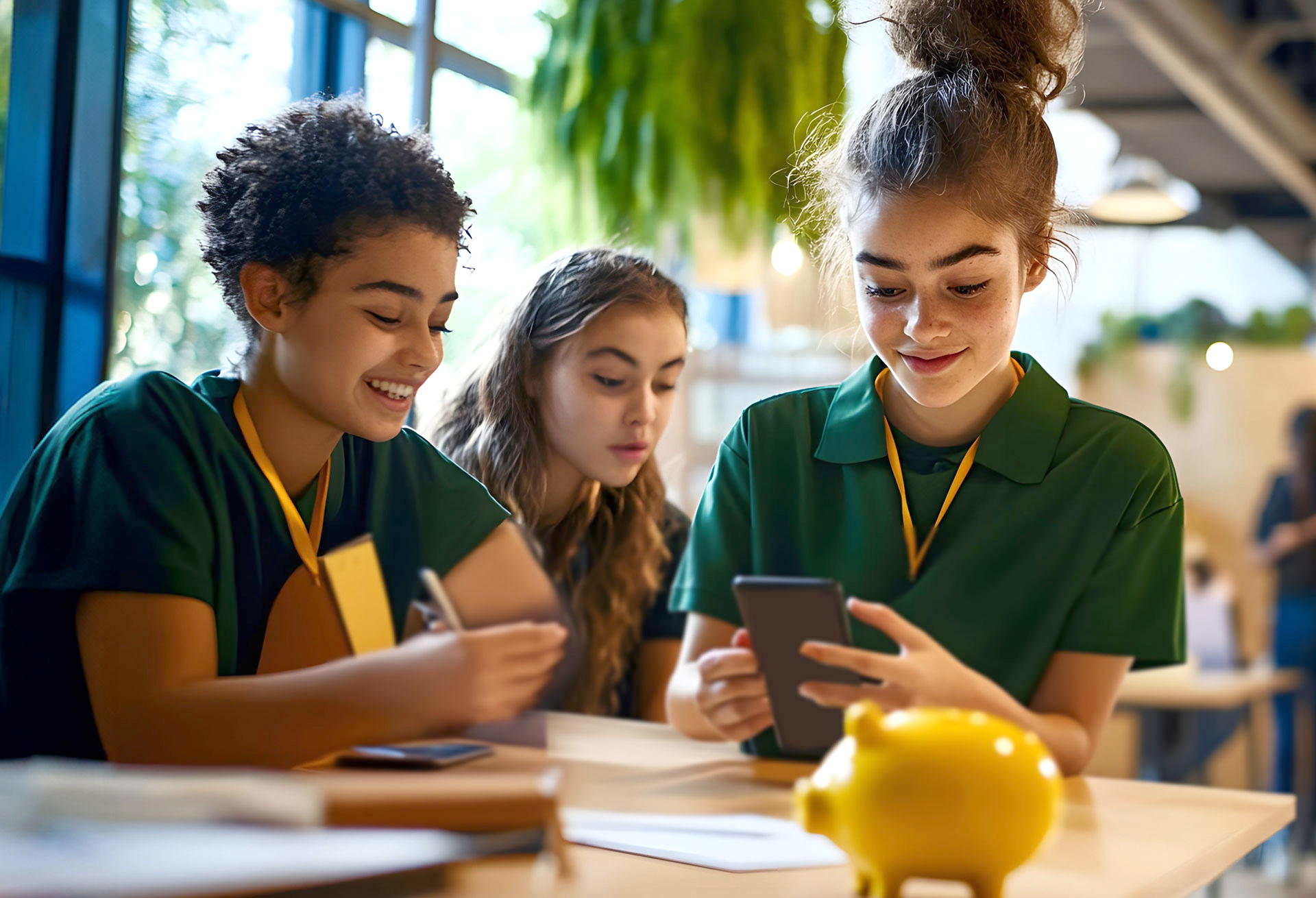 Jugendliche mit Smartphones sitzen am Tisch
