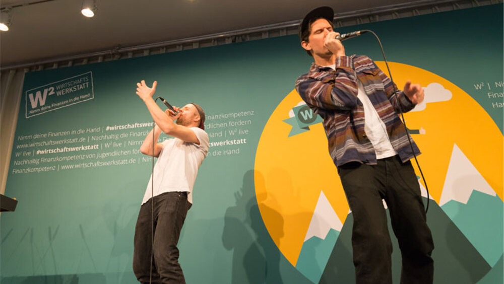 Nach der Gesprächsrunde sorgten Michael Mauder und Dr. Pop mit ihrer Comedy-Stand-Up-Show für neue kreative Energie. Und die wurde dringend benötigt. Während sich die Finalisten-Teams auf ihre Präsentationen vorbereiteten, erarbeiten ihre Klassenkameradinnen und Klassenkameraden ein neues Thema für das nächste Kolleg und testeten auch gleich das Finanz-ABC.
